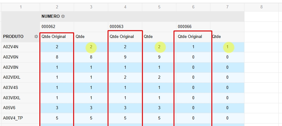 Que codigo implementar para que as colunas dentro dos quadro vermelho fiquem de uma determinada cor, como tambem quando os valores das colunas na cor amarela estiverem diferentes.
