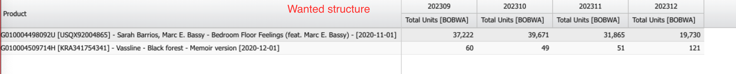 Hey there. Im currently trying to figure out how i can achieve wanted result, as presented on a screenshot. Biggest challenge here is how to display 'Total Units [BOBWA]' as child column, because when i'm applying attached config - i receive something like flat structure. Could you please assist me to undesrant, how i can achieve wanted result?