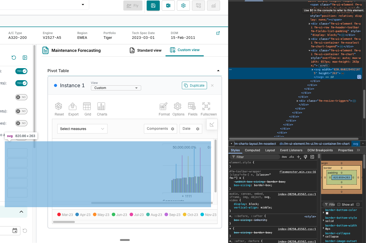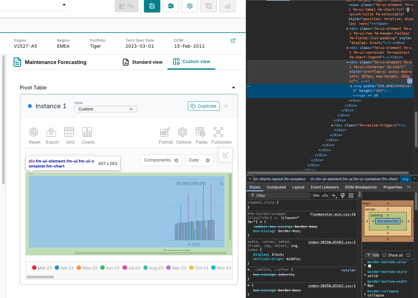 local chart svg generated (using vite): ``<svg width="1171" height="363"><g transform="translate(130.984375, 10)"><g class="fm-y fm-axis"><g class="tick" transform="translate(0,310.87999725341797)" style="opacity: 1;"><line x2="-6" y2="0"></line><text dy=".32em" x="-9" y="0" style="text-anchor: end;">0.0%</text></g><g class="tick" transform="translate(0,263.05230536827673)" style="opacity: 1;"><line x2="-6" y2="0"></line><text dy=".32em" x="-9" y="0" style="text-anchor: end;">20,000,000.0%</text></g><g class="tick" transform="translate(0,215.2246134831355)" style="opacity: 1;"><line x2="-6" y2="0"></line><text dy=".32em" x="-9" y="0" style="text-anchor: end;">40,000,000.0%</text></g><g class="tick" transform="translate(0,167.3969215979943)" style="opacity: 1;"><line x2="-6" y2="0"></line><text dy=".32em" x="-9" y="0" style="text-anchor: end;">60,000,000.0%</text></g><g class="tick" transform="translate(0,119.56922971285306)" style="opacity: 1;"><line x2="-6" y2="0"></line><text dy=".32em" x="-9" y="0" style="text-anchor: end;">80,000,000.0%</text></g><g class="tick" transform="translate(0,71.74153782771182)" style="opacity: 1;"><line x2="-6" y2="0"></line><text dy=".32em" x="-9" y="0" style="text-anchor: end;">100,000,000.0%</text></g><g class="tick" transform="translate(0,23.913845942570596)" style="opacity: 1;"><line x2="-6" y2="0"></line><text dy=".32em" x="-9" y="0" style="text-anchor: end;">120,000,000.0%</text></g><path class="domain" d="M-6,0H0V310.87999725341797H-6"></path><text class="fm-y fm-axis fm-axis-label fm-title" dy="-0.5em" transform="translate(-110.984375,155.43999862670898) rotate(-90)" style="text-anchor: middle;">Sum of Month Dollar Burn</text><line class="fm-refline" x1="0" x2="1040.015625" y1="263.05230536827673" y2="263.05230536827673"></line><line class="fm-refline" x1="0" x2="1040.015625" y1="215.2246134831355" y2="215.2246134831355"></line><line class="fm-refline" x1="0" x2="1040.015625" y1="167.3969215979943" y2="167.3969215979943"></line><line class="fm-refline" x1="0" x2="1040.015625" y1="119.56922971285306" y2="119.56922971285306"></line><line class="fm-refline" x1="0" x2="1040.015625" y1="71.74153782771182" y2="71.74153782771182"></line><line class="fm-refline" x1="0" x2="1040.015625" y1="23.913845942570596" y2="23.913845942570596"></line></g><g class="fm-x fm-axis" transform="translate(0,310.87999725341797)"><g class="tick" transform="translate(520.5,0)" style="opacity: 1;"><line y2="6" x2="0"></line><text dy=".71em" y="9" x="0" style="text-anchor: middle;"></text></g><path class="domain" d="M0,6V0H1040.015625V6"></path><g class="fm-axis-dividers"></g><g class="fm-level" transform="translate(0, 6)"><text class="fm-label" dy="0.38em" transform="translate(520.5, 8)" style="text-anchor: middle; cursor: pointer;">+ 1111<title>Click to expand</title></text></g><text class="fm-x fm-axis fm-title" dy="1.2em" transform="translate(520.0078125, 22.31999969482422)" style="text-anchor: middle;">Components</text></g><g><path class="fm-line" d="M520.5,310.87999725341797Z" style="stroke: rgb(238, 35, 44);"></path><circle class="fm-circle" cx="520.5" cy="310.87999725341797" r="4" style="stroke: rgb(238, 35, 44);"><title>Sum of Month Dollar Burn: $0